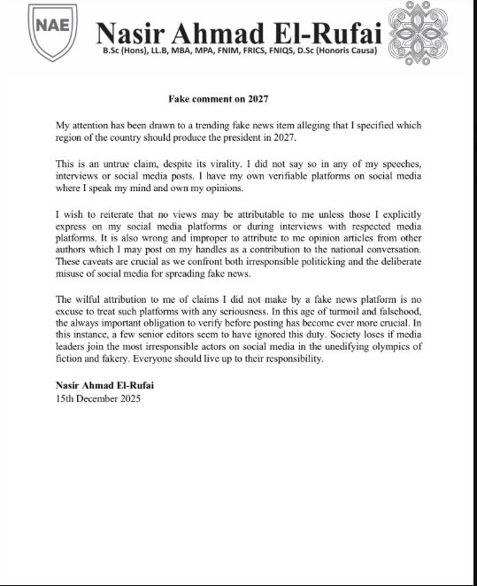 He stated, “My attention has been drawn to a trending fake news item alleging that I specified which region of the country should produce the president in 2027. This is an untrue claim, despite its virality. I did not say so in any of my speeches, interviews, or social media posts. I have my own verifiable social media platforms where I express my opinions.