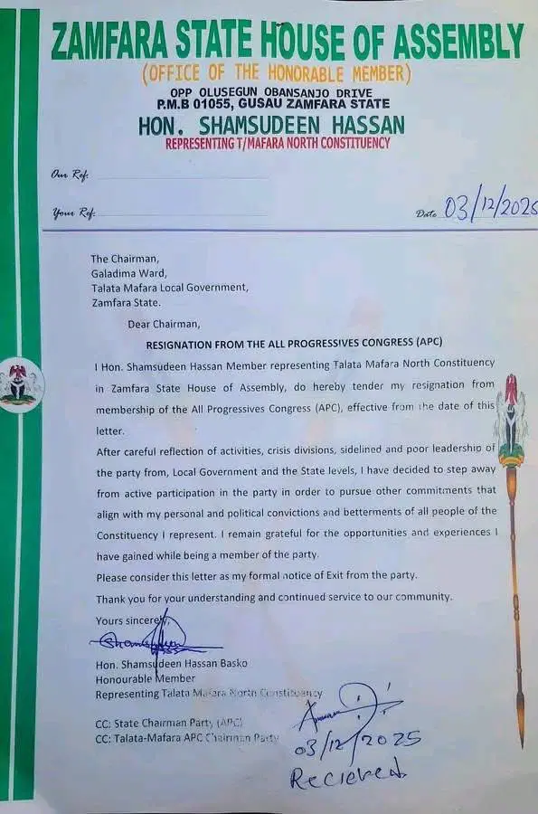 Basko requested that the ward leadership treat the letter as his formal notice of exit, noting that copies had been sent to both the Zamfara State APC chairman and the Talata Mafara Local Government chairman.